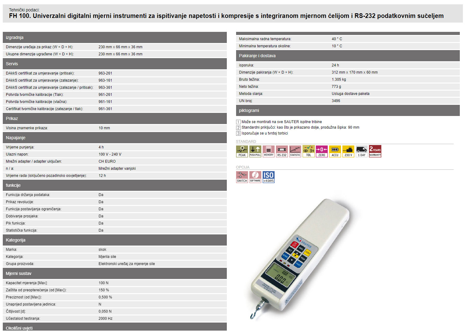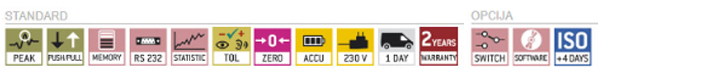 Mjerenje s tolerancijskim rasponom (funkcija granične vrijednosti): Gornje i donje granične vrijednosti koje se mogu programirati, u smjeru napetosti i kompresije. Postupak mjerenja je podržan akustičkim i optičkim signalom
