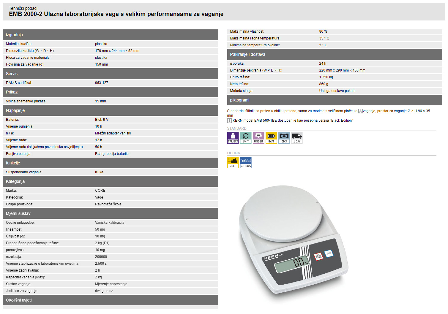 Kapacitet vaganja Max (g): 2000 Podjela vaganja (d) : 0,01 Dimenzije površine vaganja (mm): 150 mm