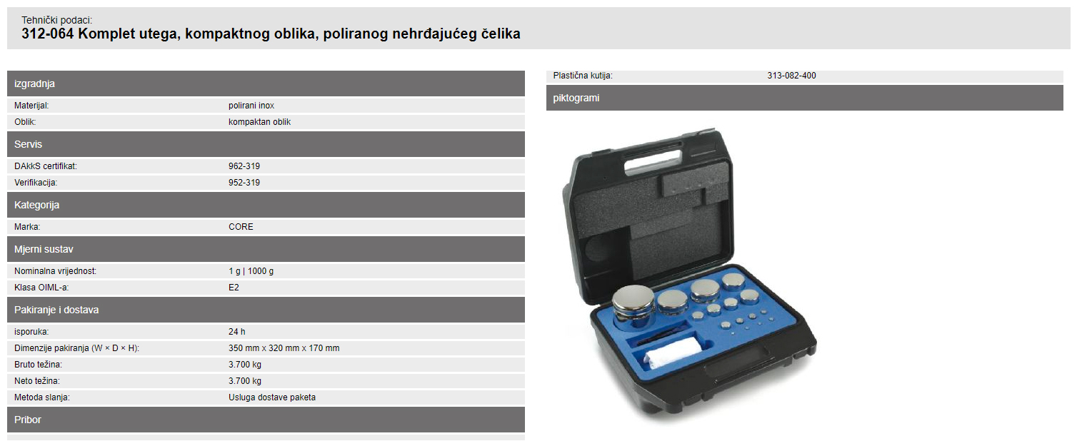 Garniture utega OIML E2 (312) Set utega, kompaktnog oblika, poliranog nehrđajućeg čelika 312-064