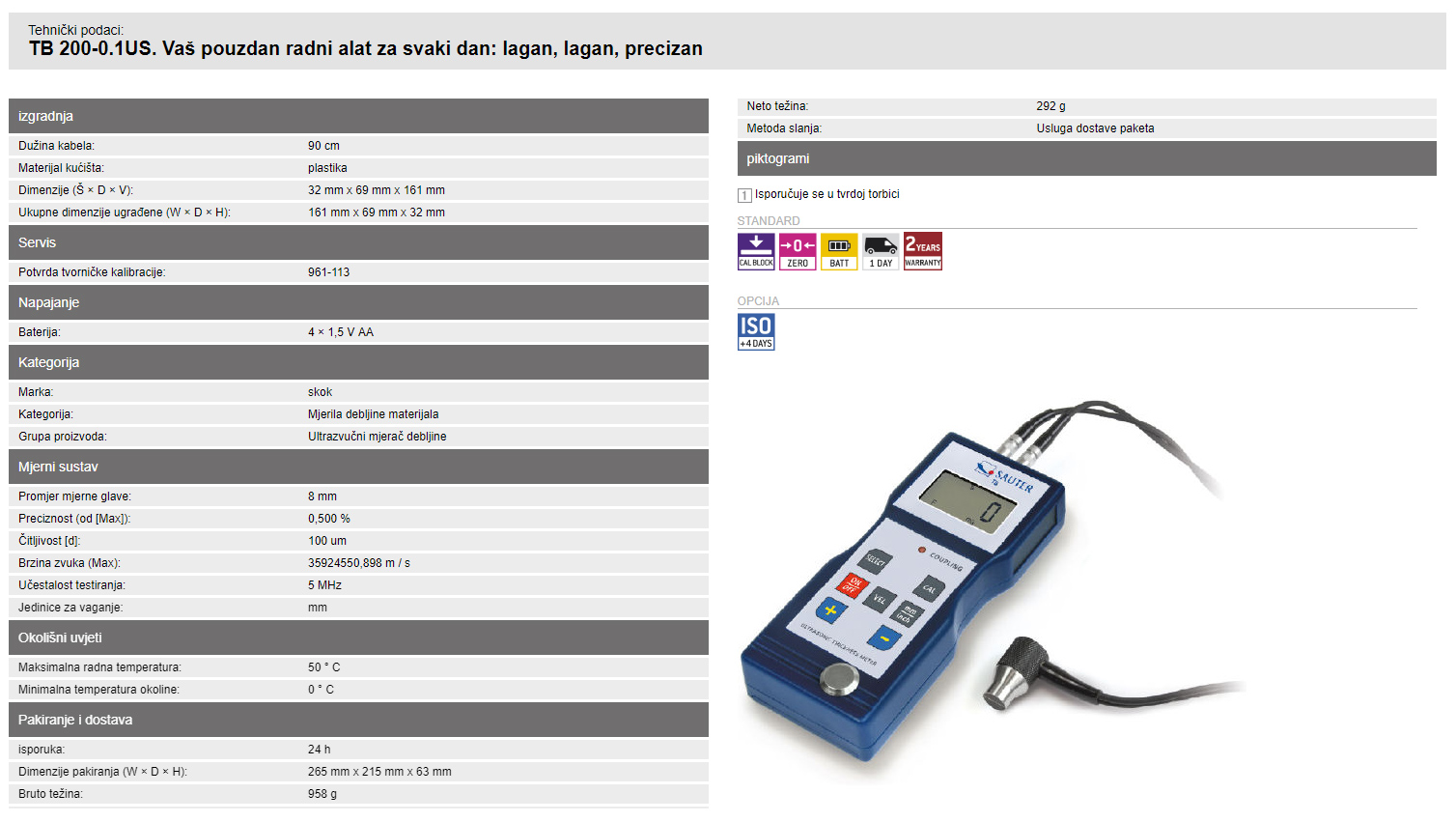 Ultrazvučni uređaj za mjeriti debljinu TB 200-0.1US.